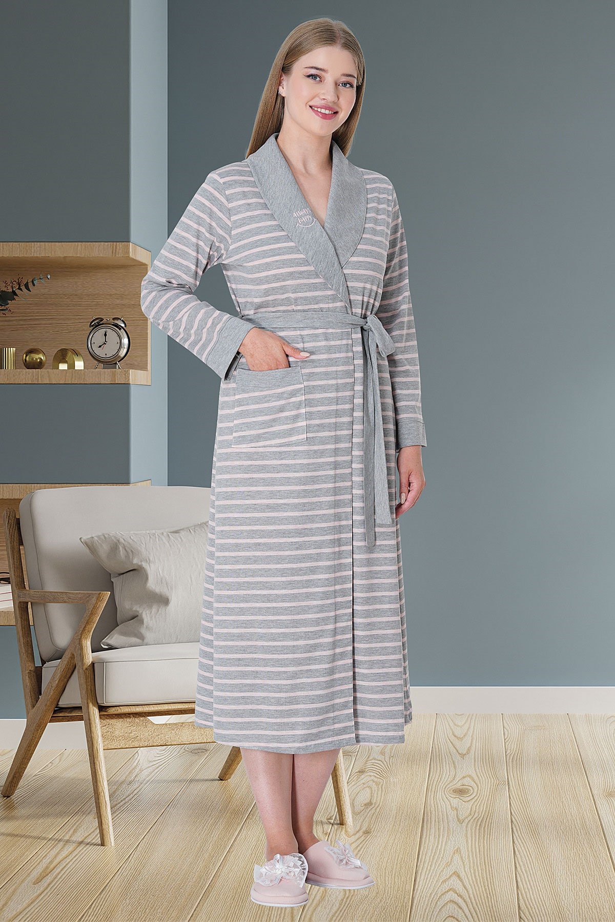 Mecit 5727 Pembe Çizgili Gri Kadın Sabahlık